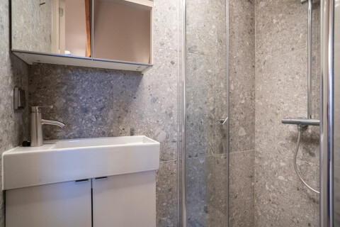 De moderne badkamer is vanuit de woonkamer bereikbaar, welke is voorzien van luxe douche en wastafel.